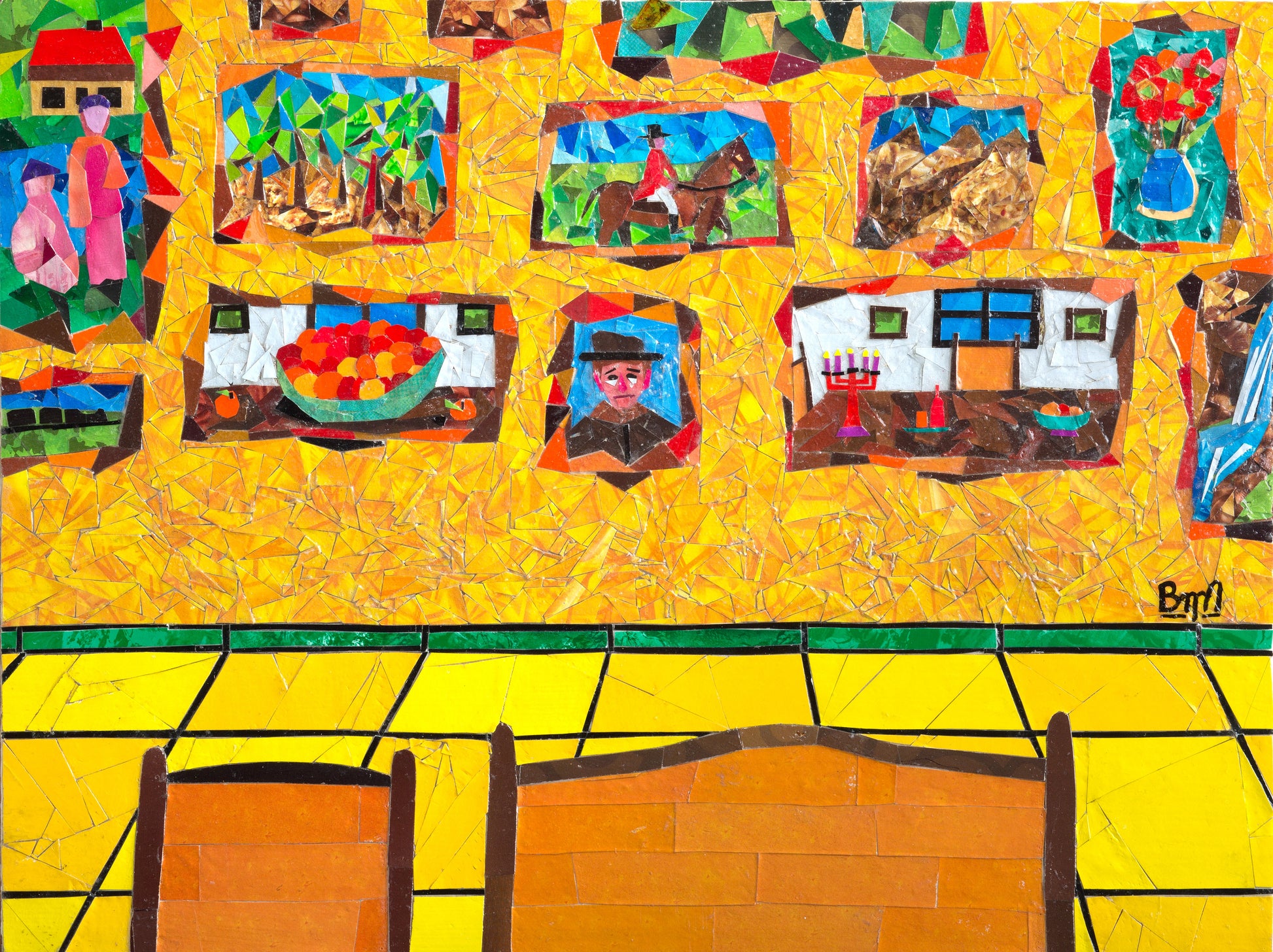 Mozage (mosaic/collage) on gessoed cardboard mounted on wood panel.