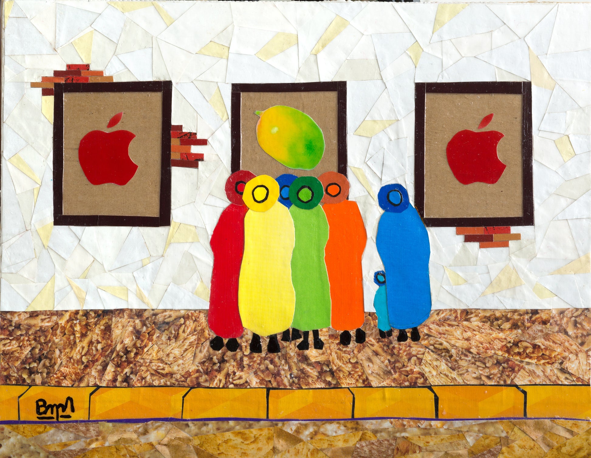 Mozage (mosaic/collage) on gessoed cardboard mounted on wood panel.