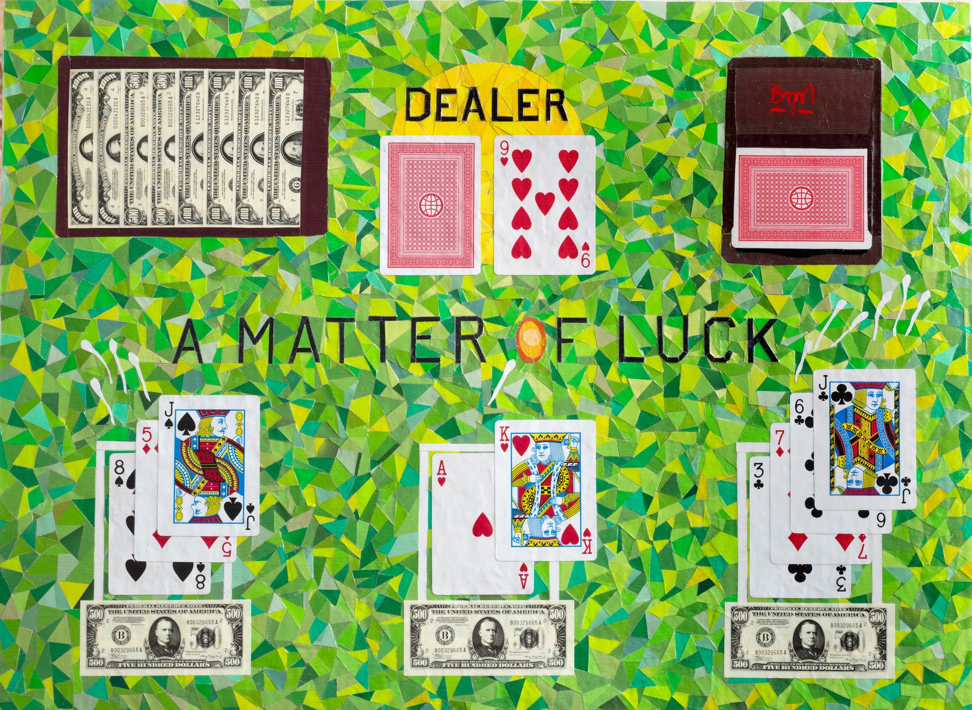 Mozage (mosaic/collage) on gessoed cardboard mounted on wood panel.