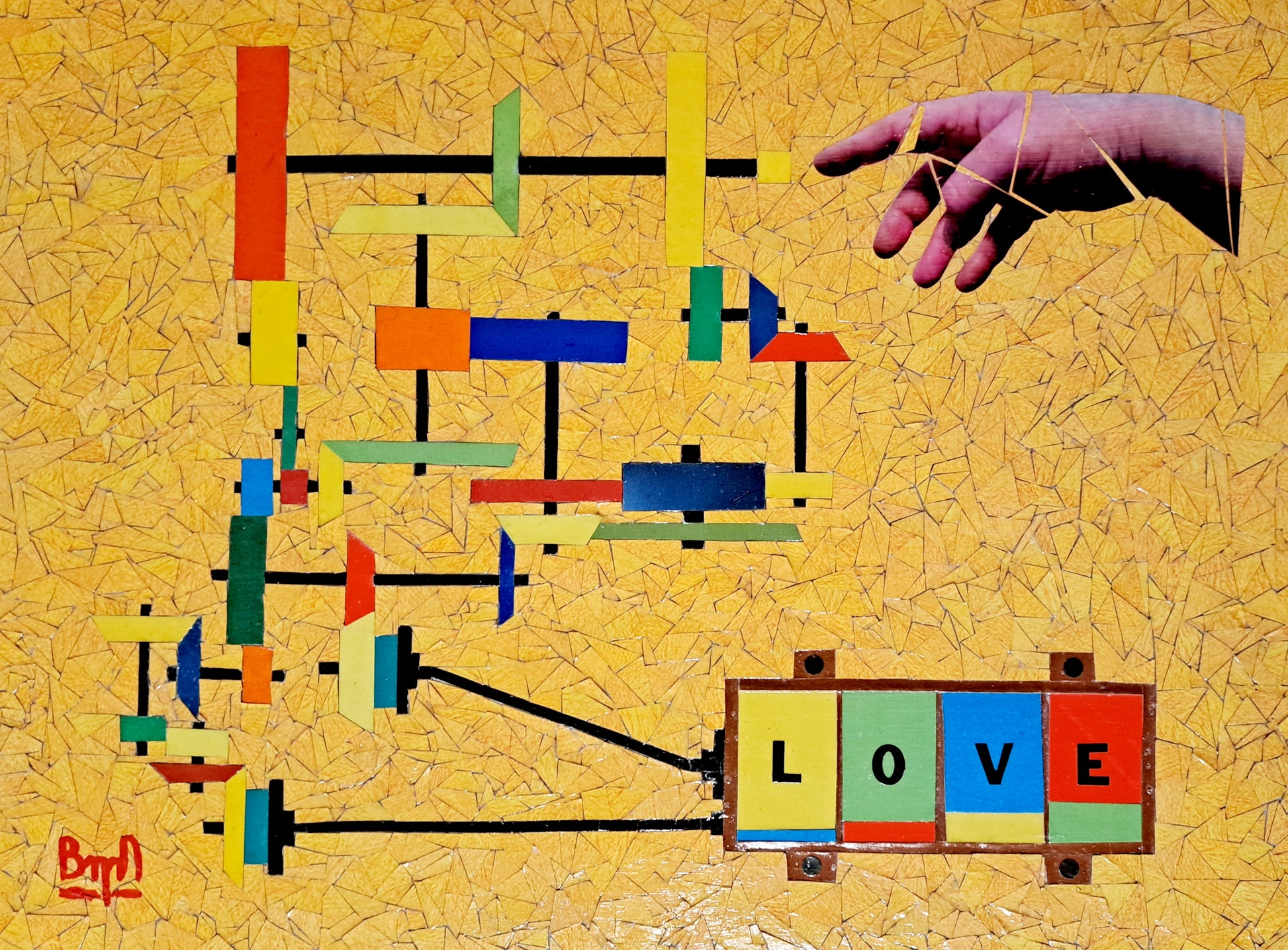 Mozage (mosaic/collage) on gessoed cardboard mounted on wood panel.