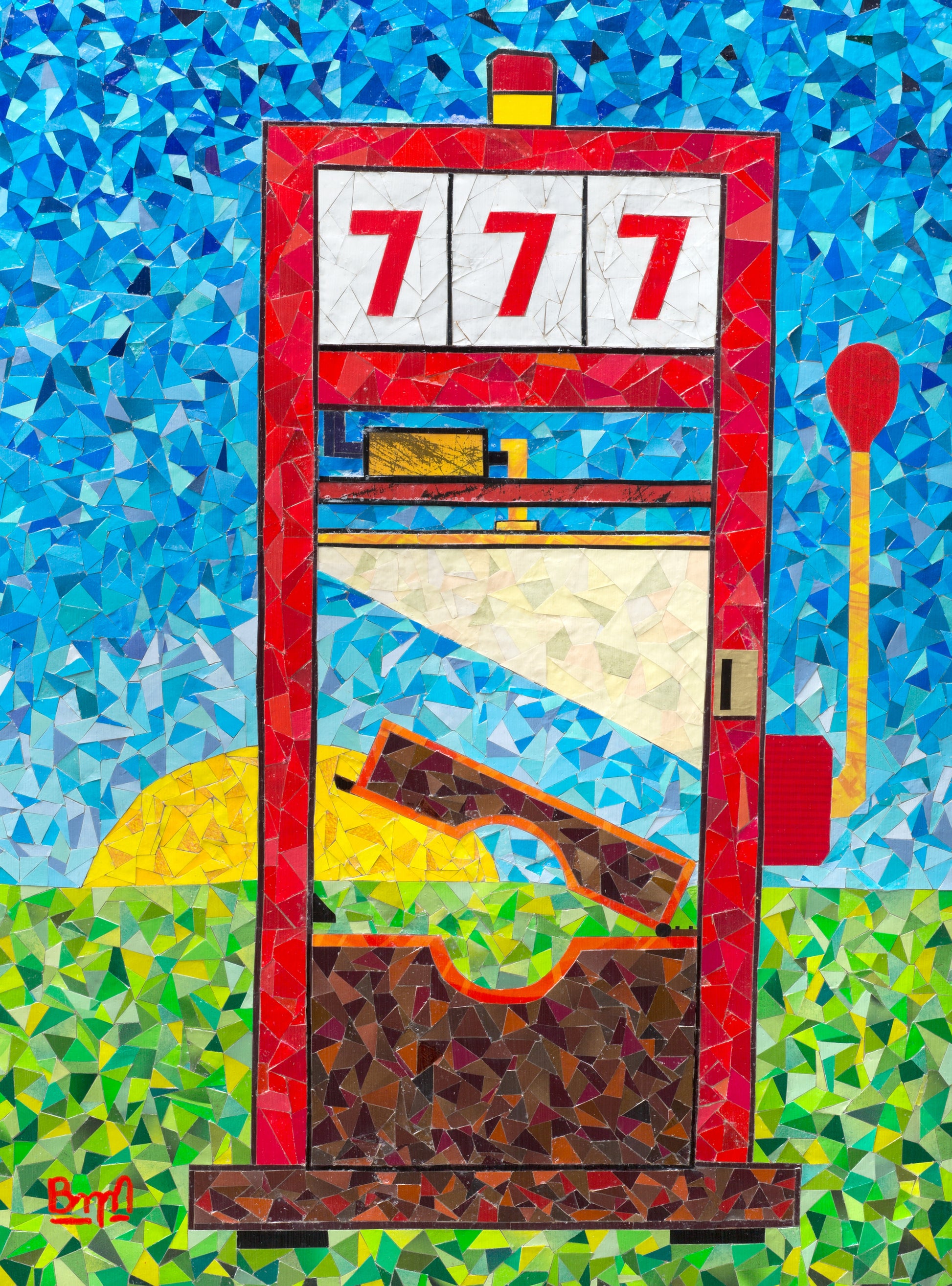Mozage (mosaic/collage) on gessoed cardboard mounted on wood panel.