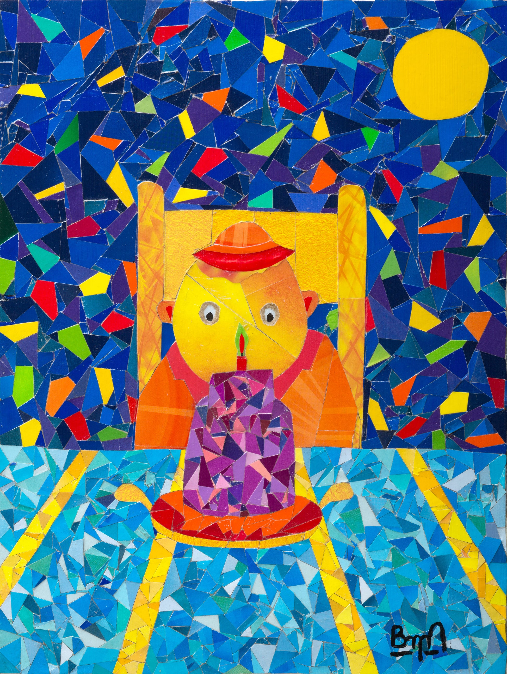 Mozage (mosaic/collage) on gessoed cardboard mounted on wood panel.
