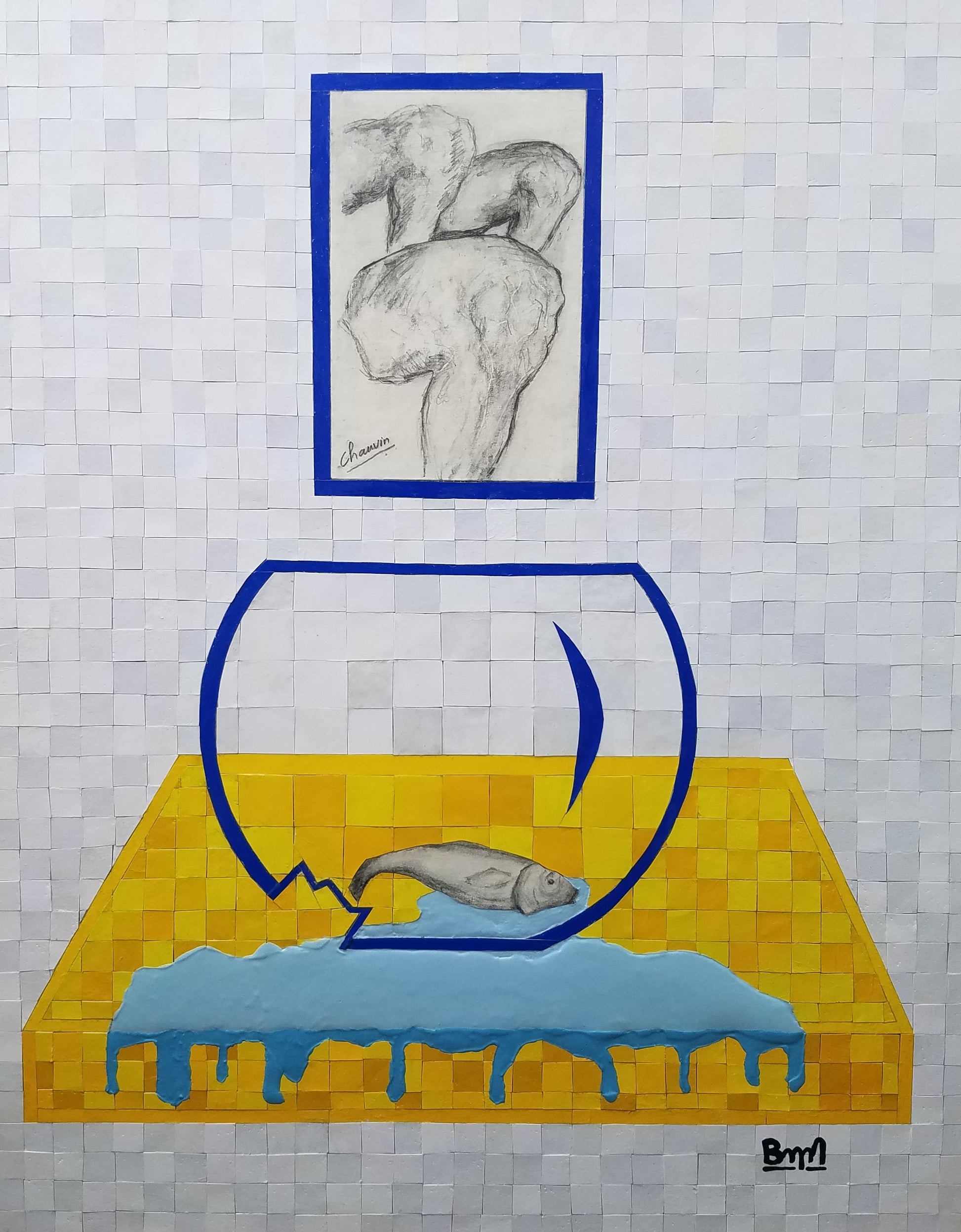 Mozage and acrylic paint and pencil on gessoed wood panel.