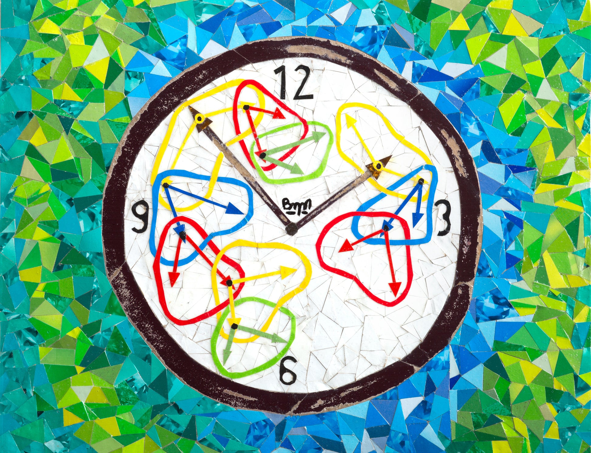 Mozage (mosaic/collage) on gessoed cardboard mounted on wood panel.