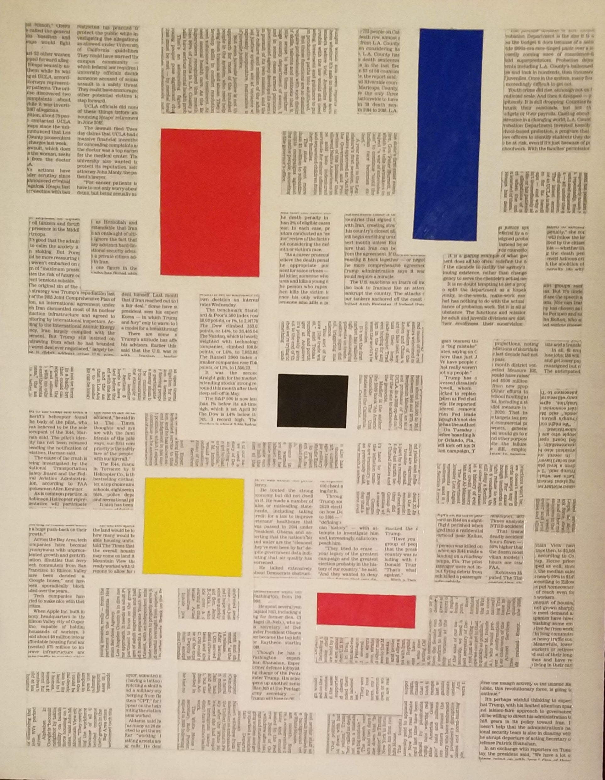 Collage and acrylic paint on gessoed cardboard mounted on wood panel.