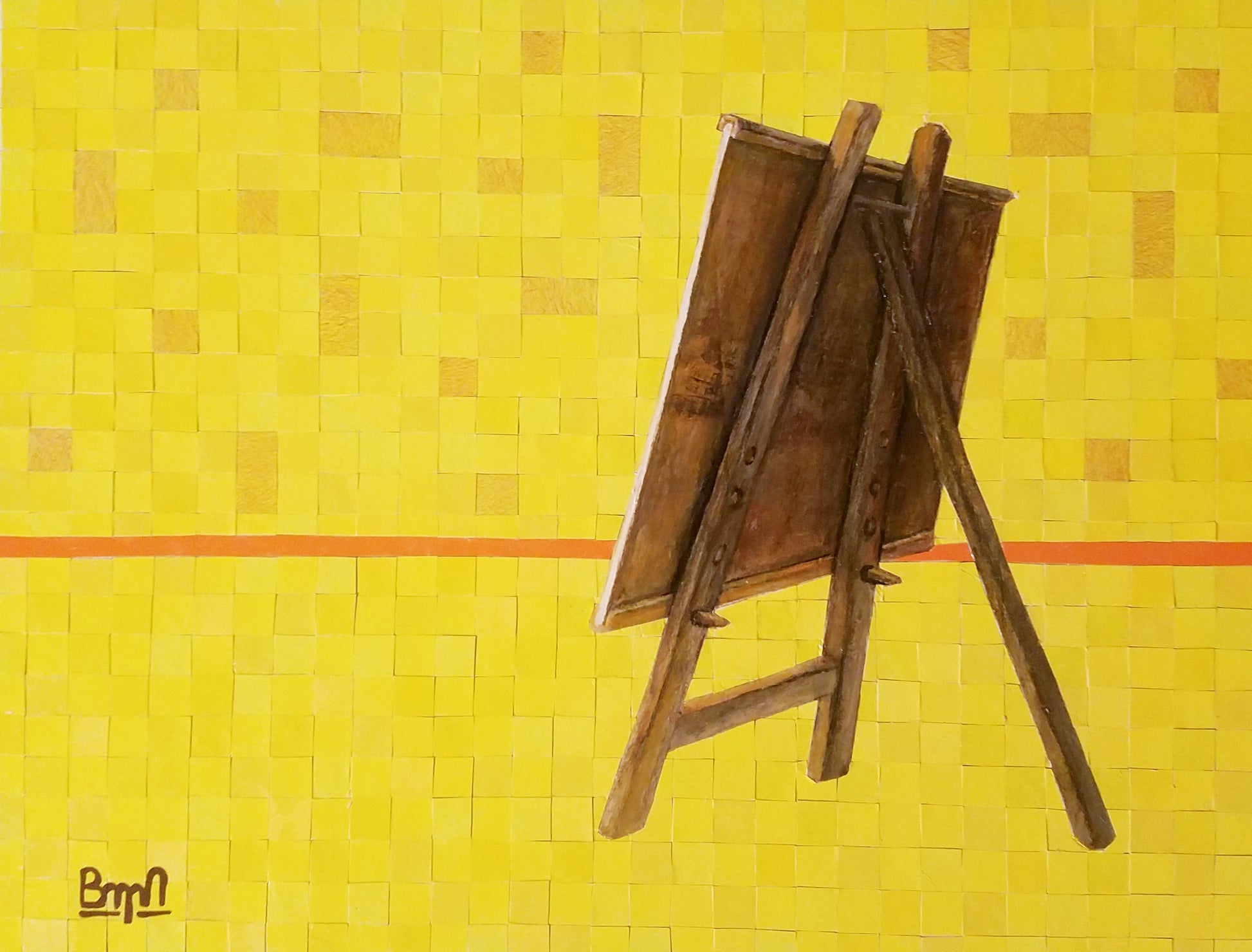 Mozage and acrylic paint on gessoed wood panel.