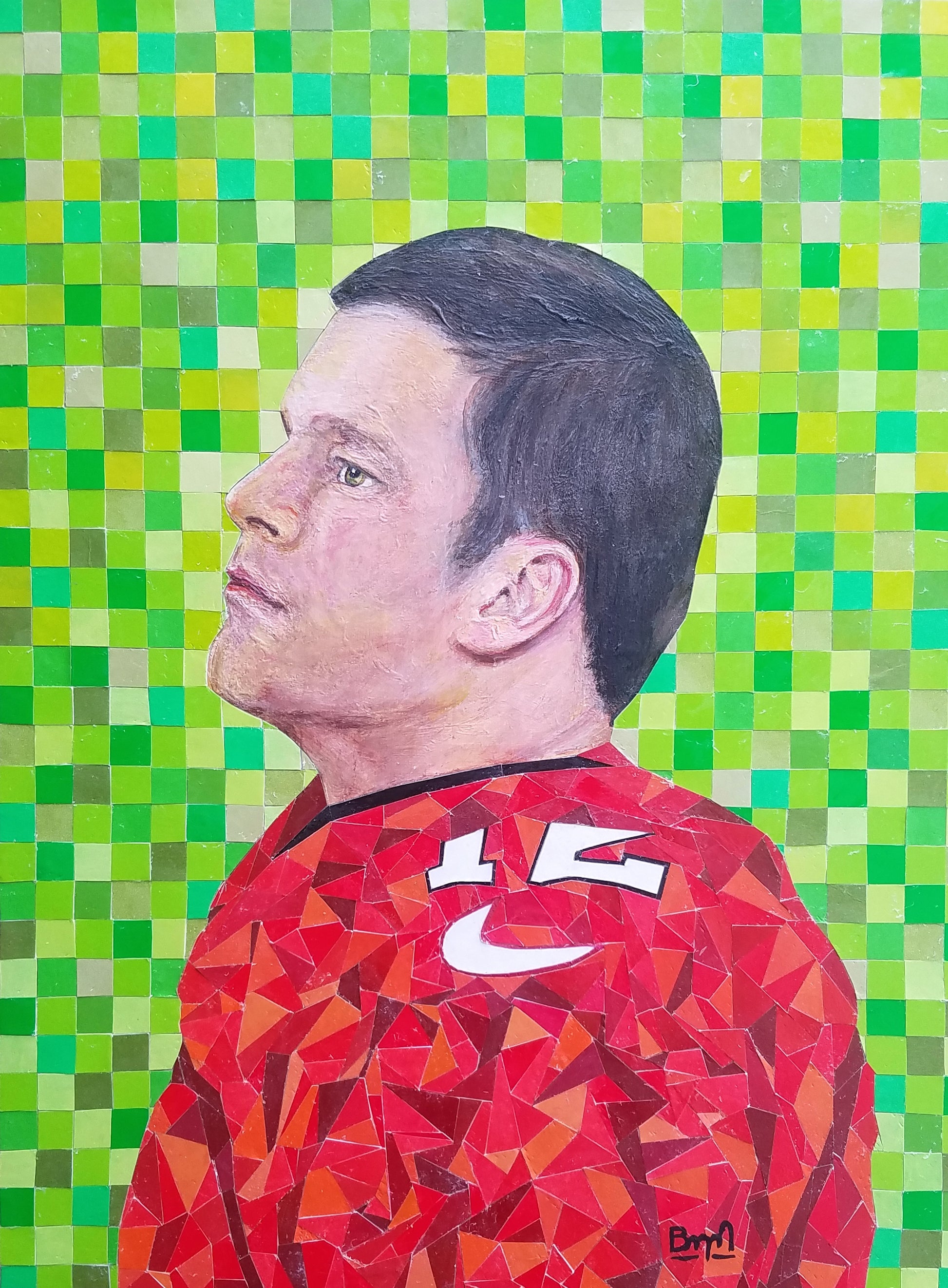 Mozage and acrylic paint on gessoed wood panel.