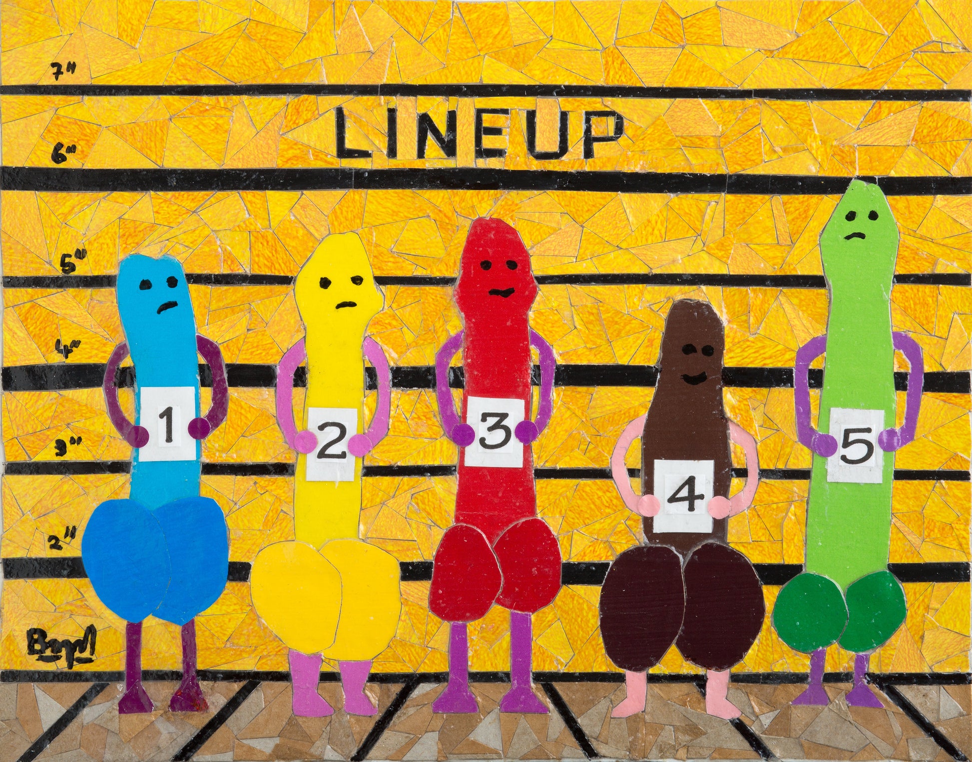 Mozage (mosaic/collage) on gessoed cardboard mounted on wood panel.