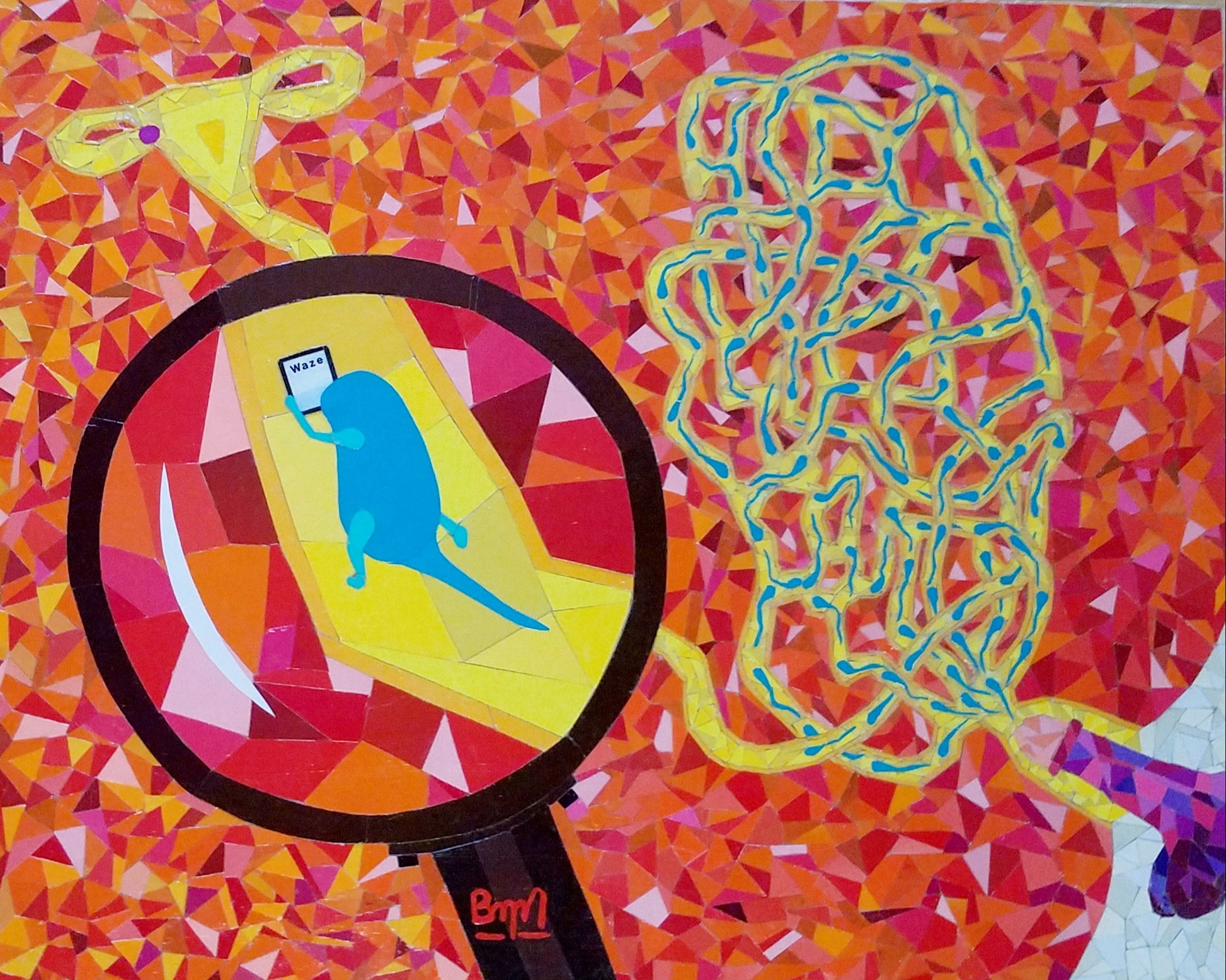 Mozage (mosaic/collage) on gessoed cardboard mounted on wood panel.